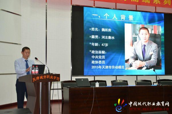 天津圣纳科技公司总经理魏所库作了题为《职业院校众创空间建设与创新能力提升》的演讲。魏所库总经理作为2015年天津市劳动模范,在演讲中回顾了企业发展历程,提出了专业、诚信、尊重、共赢的企业核心价值观,介绍了企业人才标准,描述了创客空间的特点及众创空间构建模式,为各方的创新创业提出新的思路和途径。魏所库总经理也在演讲中分享了创业心路,以及今后致力于建设创客空间、服务大学生创业的发展方向,使老师和同学们备受鼓舞。