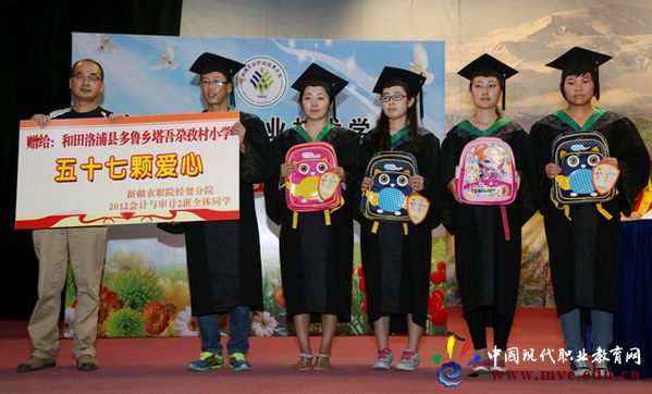 在毕业典礼上,新疆农业职业技术学院住和田洛浦县多鲁乡塔吾尕孜村工作组副组长张军老师代表和田洛浦县多鲁乡塔吾尕孜村小学接收了57名学生捐献的爱心书包。全场为这个温情的一幕欢呼鼓掌!