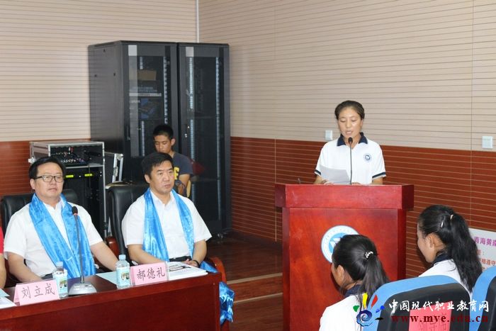 会议在东丽职教中心学校 “共筑正能量,同圆中国梦”的专题片中拉开了序幕,青海学生为领导们献上哈达,代表了学生最真诚的祝福,寄托着最美好的祝愿和最崇高的敬意。在东丽职教中心学校郝德礼校长的致词中我们感到发展中的东丽职教中心学校给我们一种力量、一种自信、一种正能力的传递、师生一起圆梦的信心。郝校长说:感谢上级主管部门把这项光荣的任务交给学校,学校会精心准备,扎实做好各项工作,以满足青海黄南州党委政府和广大人民的愿望,满足黄南会计班同学的要求。希望同学们刻苦学习,将来为家乡经济建设、民族团结、社会发展和稳定作出自己的贡献。青海学生达专措同学深受感动,她用动情的话语表达了感恩之情,她代表31颗年轻的心,用纯真的话语说出了他们求学的渴望、理想的追求、学成报效青海的决心。桑杰叶西同学带领同学们宣誓,当同学们举起右手,说出誓言的时刻也把开班仪式推向了高潮。与会领导为学生们赠送东丽职教中心学校精心制作的成长手册,希望同学们记录下在津学习生活的点点滴滴,相信这段生活会为他们青春的足迹辉写灿烂的色彩。东丽教育局孙素蓉书记在讲话中说:只有把青海黄南会计班“办出特色、做出品牌”,才能不辜负青海黄南州党委政府和广大人民群众的期盼。要“用情、用心”关爱每一个孩子,分层施教,因人施救,悉心施教。黄南教育局张海渊局长感谢天津东丽对青海黄南的支持、感谢东丽职教中心学校对学生的关爱,看到学生们的精神状态感到非常欣慰,并嘱托学生们要心存感恩,感恩国家、社会、学校、父母,努力做一名遵规守纪、明礼守信的中职生。