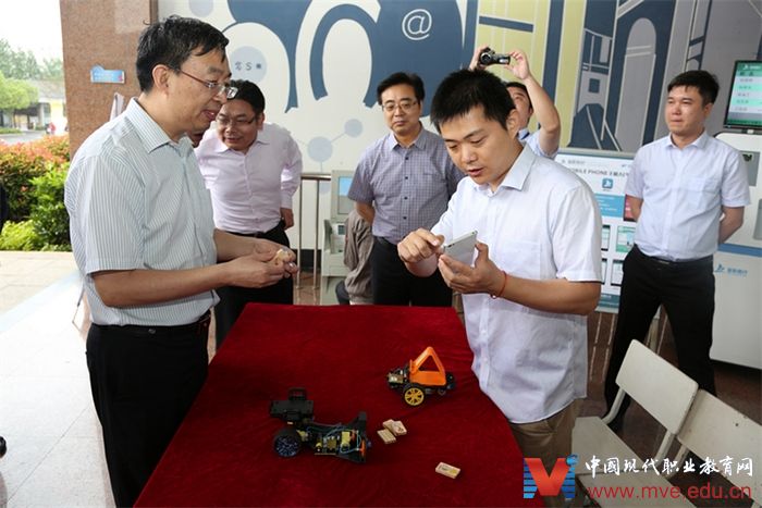 江南初夏、雨后初霁,无锡机电高职校园满目葱笼、生机盎然,空气中弥漫着江南水乡特有的清新与温润。葛道凯司长一行兴致勃勃地来到学校致用楼门厅,这里集中展示了学校近年的部分科技开发作品:“数控综合实训平台”“互联型农药残留检测仪”“基于手机功能的图形化编程运动控制小车”“多功能自助取片系统”“具备人脸识别功能的实验室信息显示系统”等。这些作品或由学校师生自主研发,或由校企合作开发,充分展现了学校的科技开发实力以及服务社会的精神风貌。