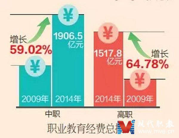 2014年,职业教育经费总投入3424亿元,比2010年增长了42.2%