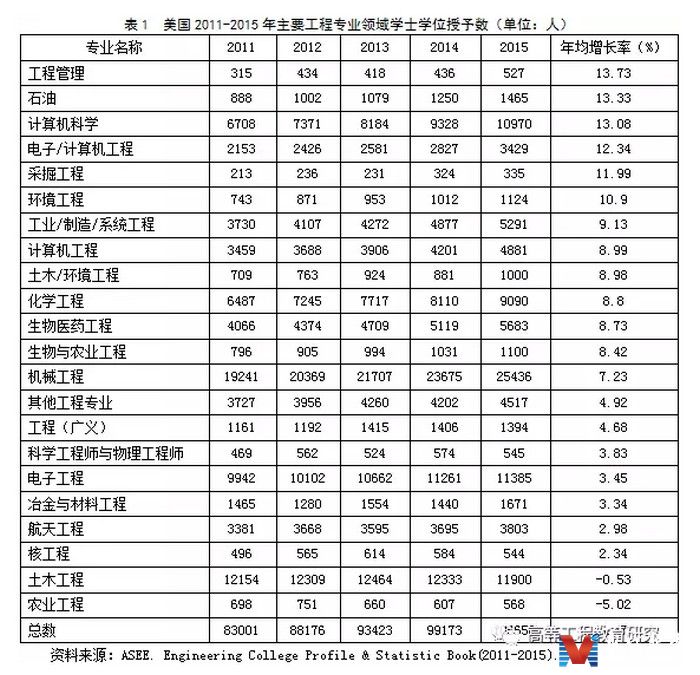 2008年金融危机爆发之后,美国实施“再工业化”战略。2009年7月,美国制造业联盟发布了《为美国制造一个更好的未来》的报告,要求政府从贸易政策、技能培训、投资研发等方面采取措施保护制造业发展。美国的工程教育响应了这一战略。2011-2015年,美国工程领域学士学位授予人数由83001人增加到106658人,年增长率保持在5%以上;硕士学位授予人数由46940人增加到57433人,2015年更是实现了11.11%的年增长率;博士学位授予人数也由9582人增加到11702人。授予学士学位的专业类型及数量如表1所示,机械工程、土木工程、电子工程、计算机科学、化学工程、生物医药工程、工业/制造/系统工程等专业规模较大,且呈现了较高的年均增长率。这些专业毕业人数的增加与近年来美国“再工业化”战略需要密切相关。
