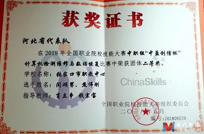 MVE网河北讯(通讯员 贾炜)5月30日,全国职业院校技能大赛赛场传来喜讯。张家口市职教中心学生闫硕男、焦伟刚在2018年全国职业院校技能大赛中职组计算机检测与数据恢复赛项中荣获团体二等奖。