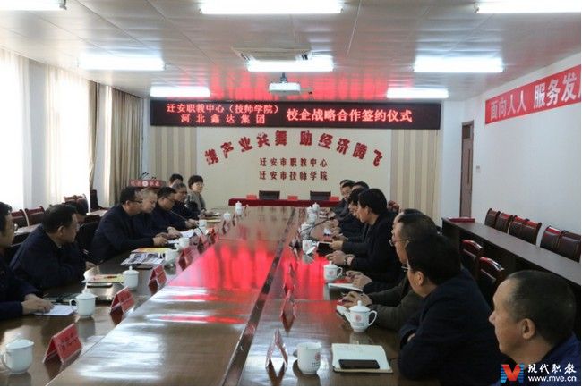 MVE网河北讯(通讯员 杨静)新春伊始,万象更新。为全面深化校企合作,共同推进技能型人才的培养。2019年2月26日,迁安职教中心与河北鑫达集团隆重举行了战略合作签约仪式,双方本着资源共享、合作共赢的理念,建立起长期稳定的合作伙伴关系。河北鑫达集团副总裁李术东、办公室副主任王爱军、董事办人才培养办公室副主任兰志英、河北鑫达钢铁有限公司人资企划处处长吕连升、唐山天茂(荣信)实业有限公司人资企划处处长董宁波、天津天道实业有限公司综合办公室主任薛立平、迁安职教中心校长凌志杰、副校长玄远程、陈小宝及相关人员出席了签约仪式。