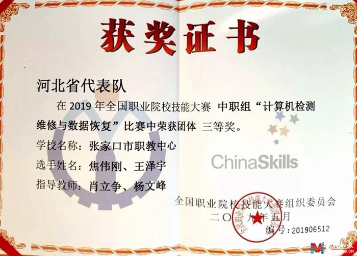 MVE网河北讯(通讯员 贾炜) 6月3日,全国职业院校技能大赛赛场传来喜讯。张家口市职教中心学生焦伟刚、王泽宇在2019年全国职业院校技能大赛中职组计算机检测与数据恢复赛项中荣获团体三等奖。