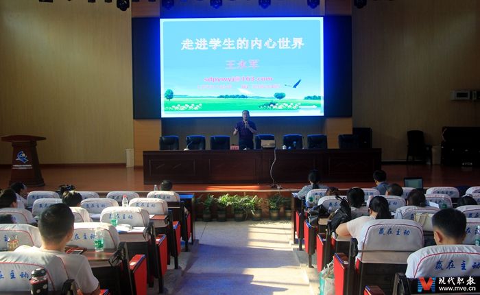 王永军以《走进学生的内心世界》为题,就职业学校的学生心理状况分析、学生的心理需要、良好心理素质的培养、学生应具备的良好心理等以详实的事例为与全校教职工作精彩的主旨演讲。
