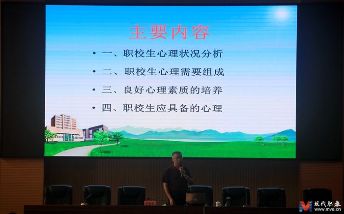 MVE网四川讯(通讯员 刘道修) 8月26日,教职工暑期学习的第二天。为加强学校双示范建设,提高教师综合素质,把握职教学生的工作方法,提升育人质量。宜宾市工职校邀请教育部国培计划优秀讲师,全国优秀班主任,山东省职业教育研究所研究员,山东省教师教育学会专家团队成员,互联网德育研究会研究员王永军在学术厅举行专家讲座。