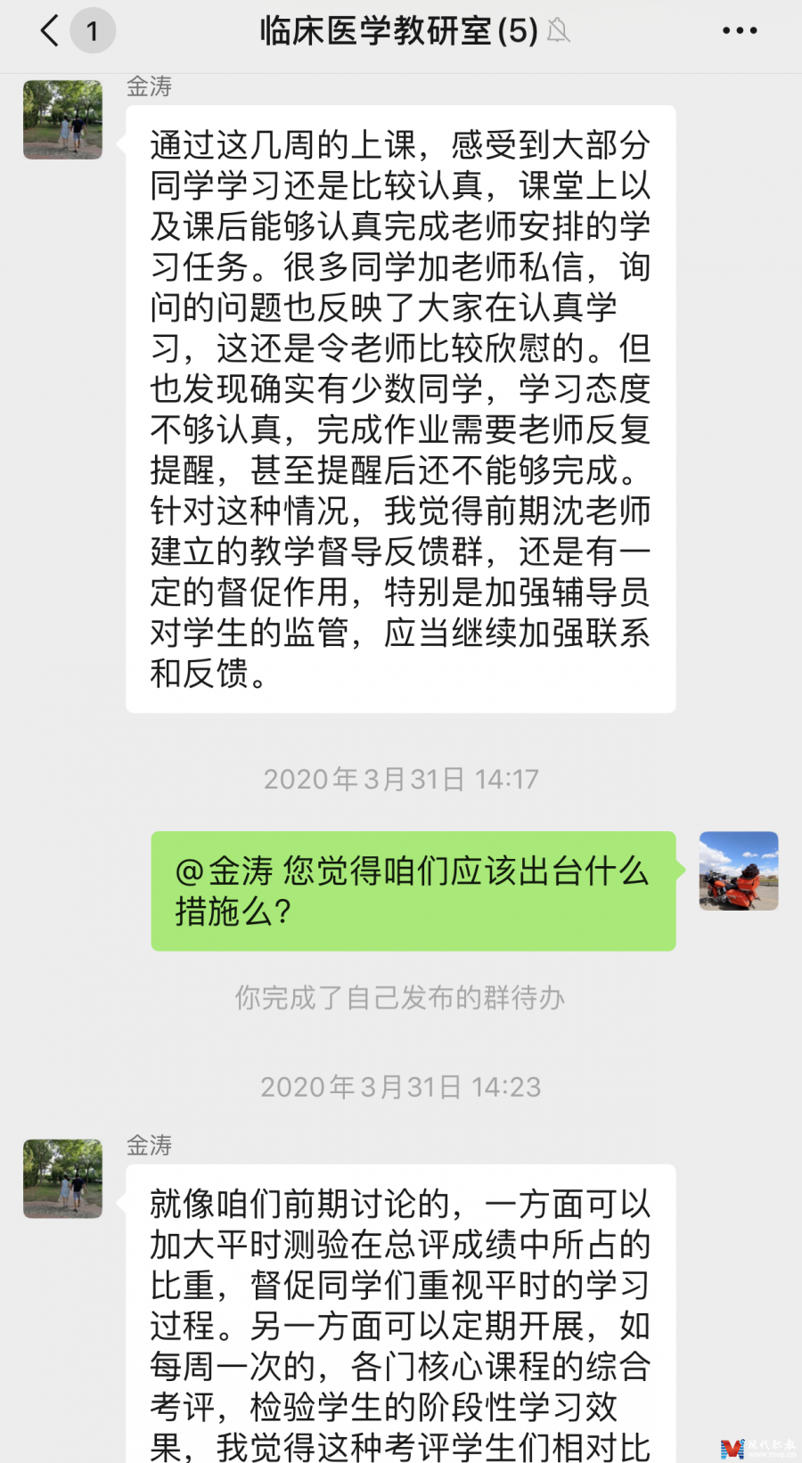 1. 各系部多措并举线推进线上教学工作。各系部充分发挥在线教学实施主体作用,开展了系列特色工作。公卫系创建系层面的教学监控调研问卷,每日定时共享数据,助力各教研室及时掌握教学情况;药检系组织线上课程教学反馈,结合居家防控设计整理家庭药品进行药品分类实践活动;口腔医学系各门课程辅教老师全程在线,帮助外聘教师组织课堂教学;技术系设计课堂教学流程表,有效把控课堂节奏;护理系强化教师线上教学能力培训,组织在线课程建设经验谈;医学系参加临床医学资源库教学联盟的“名优讲师团万人在线直播课”的课程,共建共享优质教学资源;基础部成立部门信息化服务工作组,汇总整理线上教学情况,在部门QQ群里分享和辅导;公共课教学部加强思政课线上教学,采用“双师同堂”方式,主讲教师与辅助教师同时在线教学答疑。
