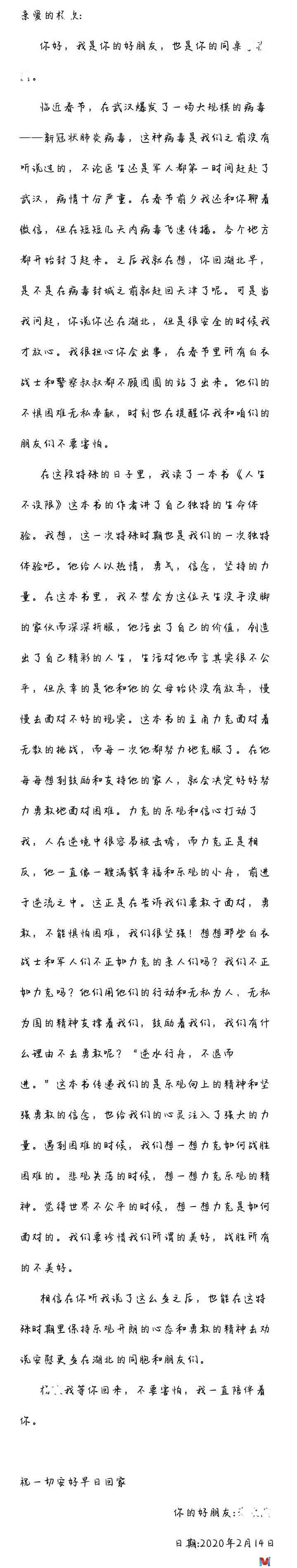 严谨的防控工作,滞留湖北的时间可能还要更长。如何度过疫情期的每一天,帮助学生克服心理困扰,踏实在家防疫是学校和班主任最关心的。疫情期学校德育组织学生们开展了《悦读经典,润泽心田》的读书活动、《劳动岗位建设与实践项目》等等,丰富学生居家生活。对于滞留湖北的学生,班级同学通过“悦读经典”,将自己的读书心得互相交流,以书信的形式互递情感,鼓励湖北的同学坚定信心,为同学鼓劲、为湖北加油、为中国加油!