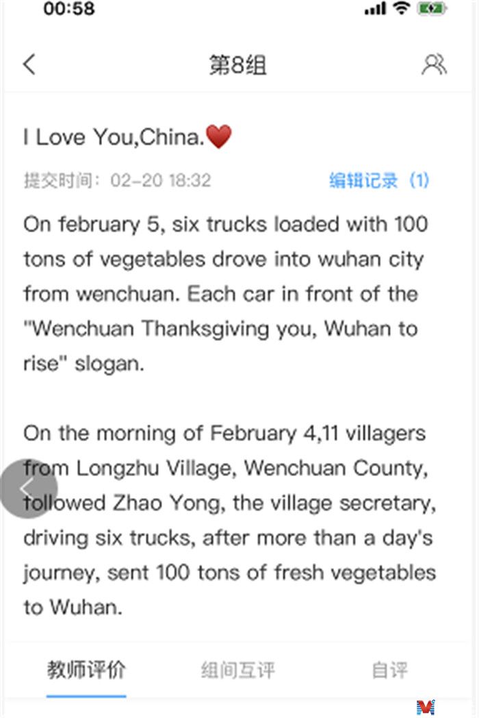 课中拓展环节,教师借助钉钉“视频会议”开启在线直播,在签到环节,利用“一平三端”的投屏实现实时签到;在课堂互动环节,利用钉钉“屏幕分享”全员连麦和视频、超星“一平三端”投屏功能实现对话、小组讨论和思辨。结合课前发放的主题讨论问题(根据不同班级的英语基础,发布不同的任务)如“Can you describe this year’s winter vocation?”“Can you list the difference between this year's Spring Festival and any previous ones?”、“Can you share some moving stories around you in the epidemic?”、“As a college student, what do you think you should do in the fight against the epidemic?”学生展示小组讨论结果。教师在线点评和总结,引导学生在这场没有硝烟的战疫中,更加关心国家和社会,在做好个人防护的同时,不添乱、不添堵,积极关注疫情;不信谣、不传谣,正确认识疫情,凝聚更多的正能量;引导学生重新审视和反思生命观和价值观。