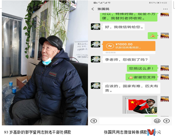 老同志们通过微信转账捐款,自己不会用就让儿女代转,还有的亲自将捐款送到老干部处办公室。93岁的郭学鉴老人,亲自来到老干部处捐款1000元,他说:“国家有困难了,应该的”;65岁的张国民老师通过微信捐款1000元,他表示“国家有难,匹夫有责”;学院原党委书记、院长赵济生同志,原院级领导姚润生同志均带头捐款1000元,以表达对抗击疫情的支持。这些老同志质朴的言语,果决的行动,感动了老干部处和在场的所有人。老同志们的善举汇成一股暖流,汇集起学院阻击疫情的强大力量。众志成城,共克时艰!
