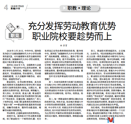 我们看到,劳动教育是重塑职业教育形象地位和学涯规划端口前移的一个大好机会。职业院校做得还不够、想得还不深,还得更积极更主动更充分地发挥自身的劳动教育优势,乘势而上。