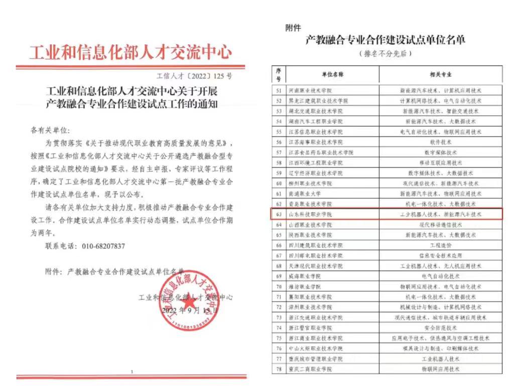 近日,工业和信息化部人才交流中心公布了第一批产教融合专业合作建设试点单位名单,山东科技职业学院成功入选试点单位,工业机器人技术、新能源汽车技术两个专业成为首批试点专业。