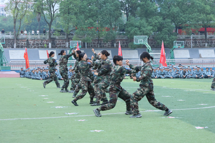 成果展示环节成为整场大会的“高光时刻”。方阵队步伐铿锵、整齐划一,尽显纪律之美;红旗队高举旗帜、迎风向前,传递昂扬斗志;五战拳刚劲有力、招式利落,展现军人素养;刺杀操、防暴队形演练与抓捕环节紧张有序,尽显实战能力;旗语方阵手势标准、默契配合,诠释协作精神;战术演练情景逼真、动作干练,彰显青春担当;分列式环节,各队伍依次通过检阅台,嘹亮的口号响彻田径场,赢得现场阵阵掌声。