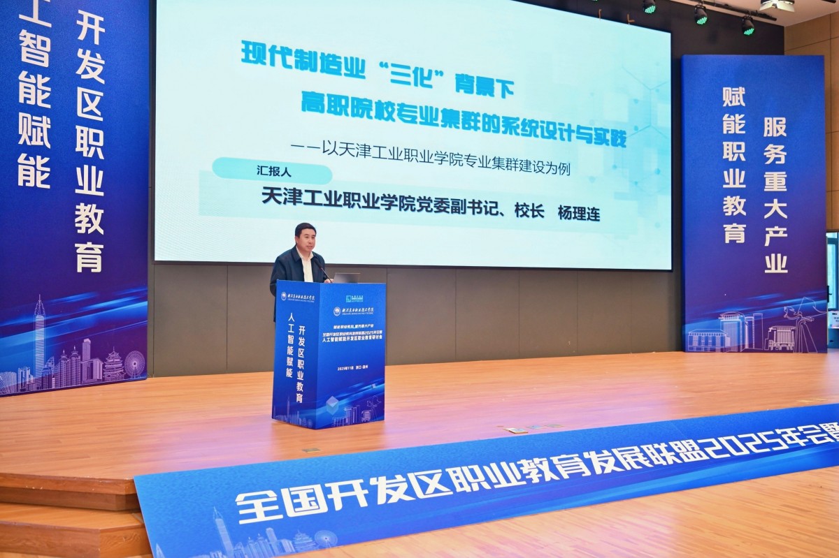 在主题报告和院校分享环节,一批鲜活的实践案例展现了开发区职业教育的创新活力。天津工业职业技术学院校长杨理连介绍,学校面对制造业高端化、智能化、绿色化转型,构建绿色智能制造专业集群,通过“课程贯通、学训基地共享、教师流通、学分互认”四通模式,实现15个专业资源整合,毕业生满意度达96%。