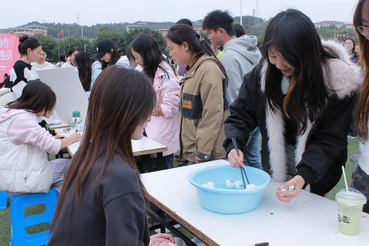 “热词碰碰碰”让学生们在纷繁词语中精准筛选党的二十大及二十届历次全会核心热词,在快速反应中深化对国家发展规划的理解;“非遗密码你划我猜”聚焦中国非物质文化遗产项目,学生们在肢体比划与默契配合中,增强了文化认同与“四个自信”;“生态使命分类大师”活动则将习近平生态文明思想具象化,引导学生从垃圾分类等身边小事做起,争当生态文明的践行者与传播者;“拼”出现在与未来活动设计了C919、花江峡谷大桥、校园一景等诸多拼图,让学生在拼接中直观感受科技创新成果与学校发展,深化民族自豪感与爱校荣校情怀;“盲盒拆拆乐·探秘乡村振兴”精选20余种特色农产品与道地药材让学生拆盲盒、配产地,理解乡村振兴的核心逻辑,让“专业服务国家战略”的认知更深刻;“圈”出重点将“中国梦”“五位一体”总体布局“新发展理念”等《概论》课核心知识点制成专属套圈靶,学生按理论逻辑顺序套中目标,在竞技中强化知识记忆与内在关联;“强国有我”让学生用“五谷”绘制中国地图,在指尖拼绘国土的过程中厚植家国情怀,立下“投身民族复兴”的青春誓言。