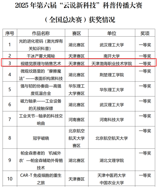 天津渤海职业技术学院财经商贸学院张子文老师带领的教师团队,携作品《视错觉原理与销售艺术》从区域赛一路突围,经全国赛初评成功晋级总决赛。作为赛事中唯一的职业院校代表队,与南开大学、武汉理工大学等重点本科院校同台比拼,最终在理工科主导的赛事中脱颖而出,斩获全国一等奖(第三名),充分彰显了学院职教科普水平与育人成效。