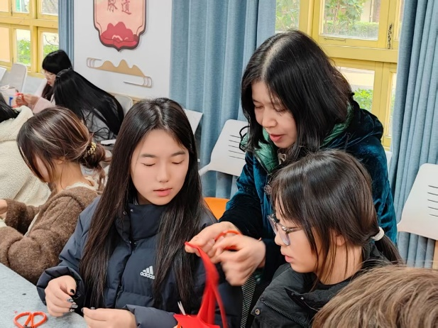 通过搭建校地合作平台,积极推进非遗传承人教学参与机制的建立,为传承人深度融入课程设计、实践指导等教学环节提供制度保障,逐步构建“学校主导、学生参与、传承人指导”的协同育人模式。10月22日,国家级非遗“伞制作技艺(西湖绸伞)”代表性传承人宋志明团队受邀入校,通过手把手教学带领学生完成选竹、劈骨、穿线等制伞全流程,让传统技艺在校园焕发新生。12月3日,余杭区非遗传承人陈富梅老师开设剪纸艺术体验课,通过“一剪一世界”的指尖创作,将剪纸艺术的千年文脉转化为可触可感的现代审美,这些活动不仅丰富了学生的校园生活,更让非遗技艺在青春心灵中生根发芽。通过打造非遗文化基地,青年学子在绸伞、剪纸等实践活动中亲身体验传统技艺的精髓,更化身传习宣推官,以创新思维赋予非遗现代活力。