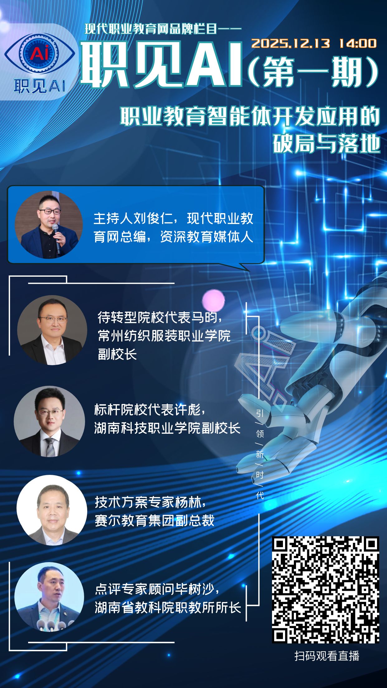 别担心!12 月 13 日 14:00,「职业院校智能体开发应用」系列直播首期重磅开启,聚焦 “职业院校智能体开发应用的破局与落地”,邀四方权威嘉宾共探全流程解法,给您低成本、可复制的落地方案,帮院校轻松跨越 “智能体开发鸿沟”!