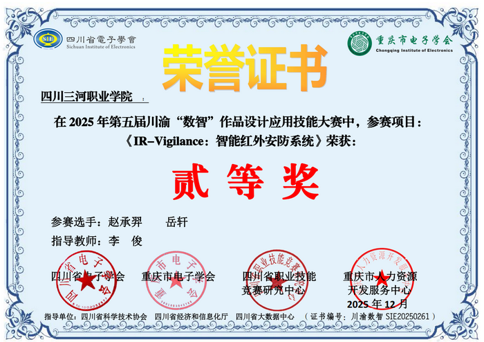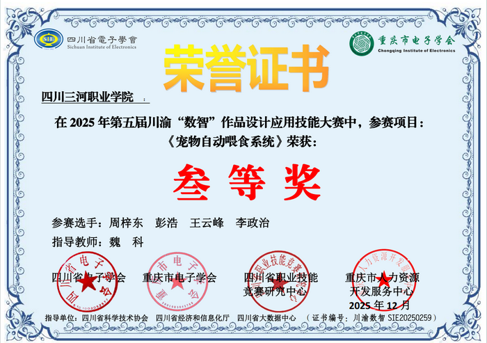 近年来,四川三河职业学院高度重视数智化转型与人才培养工作,聚焦产业需求优化专业布局,强化实践教学与创新创业教育的深度融合,搭建起完善的技能竞赛与成果转化平台。此次获奖是学校“以赛促学、以赛促教、以赛促创”育人模式的生动实践。未来,学校将继续深耕数智领域人才培养,推动技术创新与产业应用深度融合,为川渝地区数智经济发展输送更多高素质技术技能人才。