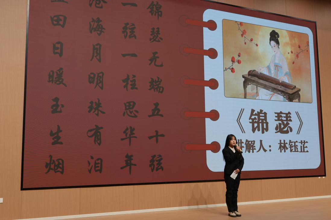 作为学校“大思政课”建设与“遇见良渚”思政教育共同体的重要联动载体,本次竞赛自启动以来便得到全校学子热烈响应,经初赛、复赛的层层遴选,14位选手凭借扎实的诗词素养与创新的表达能力脱颖而出。决赛现场,选手们循着诗词脉络,串联起华夏文明的精神谱系:从陆游《金错刀行》的报国壮志中,解读中华民族的爱国基因;从王维《青溪》的山水禅意里,体悟生态文明的古老智慧;从李白《梦游天姥吟留别》的浪漫豪情中,感受追求自由的精神品格。更有选手将五千年前的良渚玉琮的微雕技艺与古典诗词中的“坚守匠心”相呼应,让良渚文明与中华诗词的人文情怀同频共振。比赛间隙,瑞狮献福表演精彩亮相,灵动的狮影既展现了传统民俗的魅力,更象征着文脉传承的奋进力量,为这场思政与文化盛会增添了喜庆氛围。