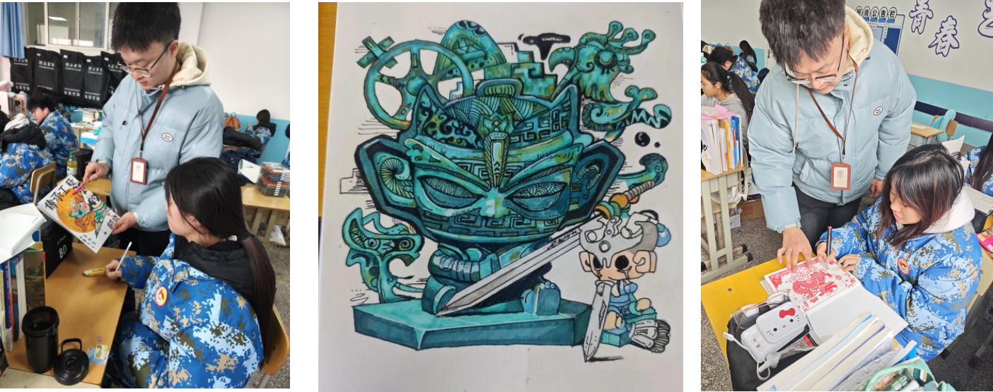 课程引入AI图像分析手段,通过观看《非遗里的中国》节目,引导学生对非遗元素进行解构。例如,在“传统剪纸数字化再生”绘制中,学生提取不同的剪纸造型,通过生成式AI模拟不同剪纸形式,观察传统剪纸艺术在当代视觉语境下的多种组合的可能性。“AI不是替代创作,而是拓展我们的审美数据库。”艺术设计专业学生分享道,他在设计《非遗青年造物集》中“三星堆”时,先用AI生成数十种三星堆样式草图,再从中选择最具神韵的三种进行手绘深化,使古老纹样既保留原始韵味,又贴合现代审美。