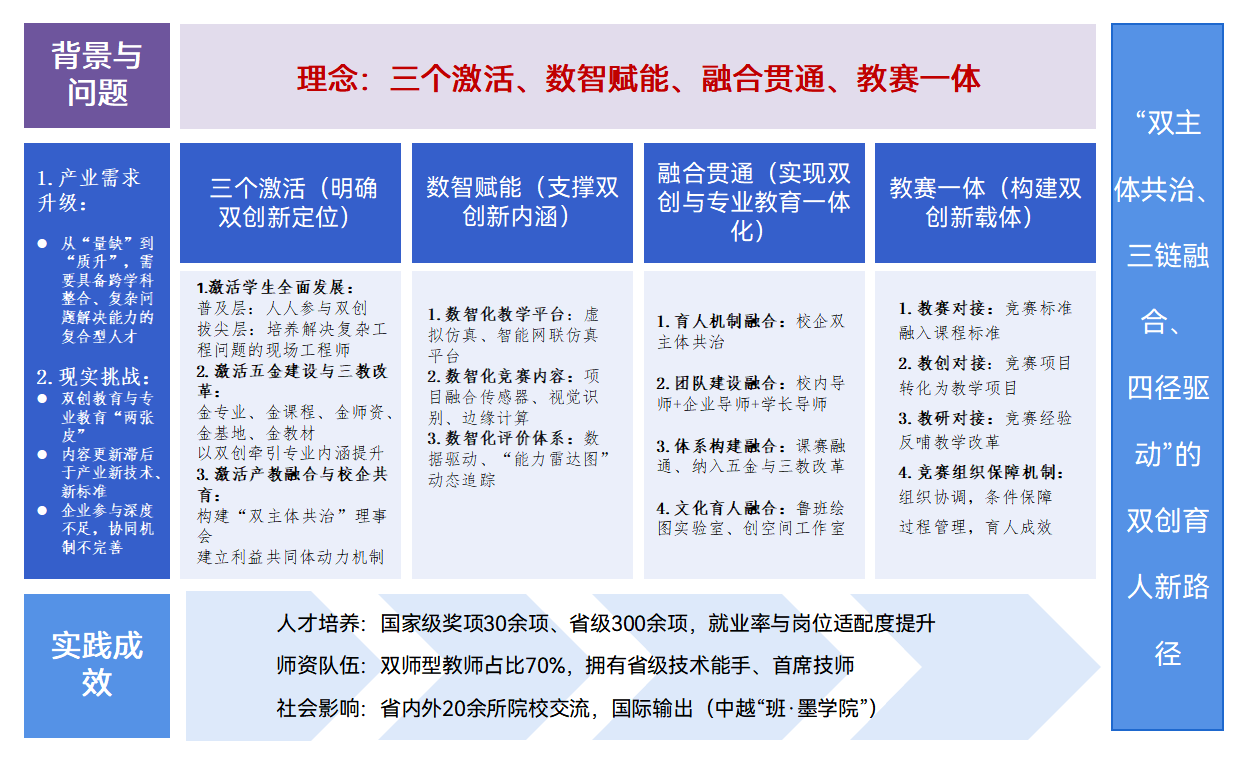 理念创新:以“三个激活”明确双创育人新定位,将双创教育从单纯竞赛导向升维为“学生全面发展、专业内涵提升、产教深度融合”的多元目标体系。