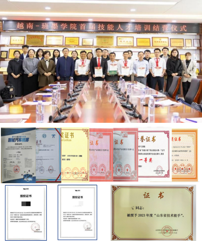 学院以双创教育推动“五金”建设和“三教”改革。金专业:精准定位新能源汽车专业群培养目标,形成与产业链紧密对接的专业布局。金课程:联合企业开发《智能网联汽车线控底盘技术》等双创特色课程。金师资:打造校企混编双创导师团队,双师型教师占比超70%,拥有山东省技术能手、齐鲁首席技师等。金基地:建有交通工程训练中心,含14个实践教学区域,自主创建“鲁班绘图实验室”和“创空间工作室”,累计培养竞赛学生400余人。金教材:编写《汽车构造与维修》《汽车构造》等教材,立项4门省级资源课程、多门校级在线开放课程。